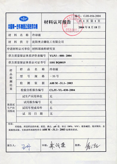 沈陽奧吉娜化工有限公司繼防凍液獲得一汽集團技術(shù)中心認證后,DOT3制動液于09年5月13日再次獲得一汽集團技術(shù)中心認證,為奧吉娜化工有限公司制動液在一汽集團所屬的汽車制造廠和售服系統(tǒng)推廣提供了及其有力的條件。使得雙方在配套領(lǐng)域的合作關(guān)系得到了進一步的加強。同時提升了奧吉娜化工在全國范圍內(nèi)汽車油品配套領(lǐng)域的知名度和影響力。