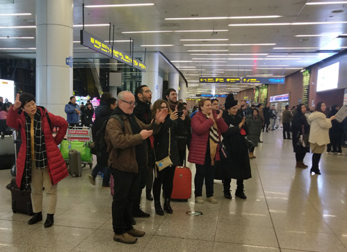(圖)在沈陽桃仙國際機場齊頌《沁園春·雪》時,一群外國友人為奧吉娜集團科創先鋒團拍照鼓掌,他們沒想到中國人是如此崇拜毛澤東主席。