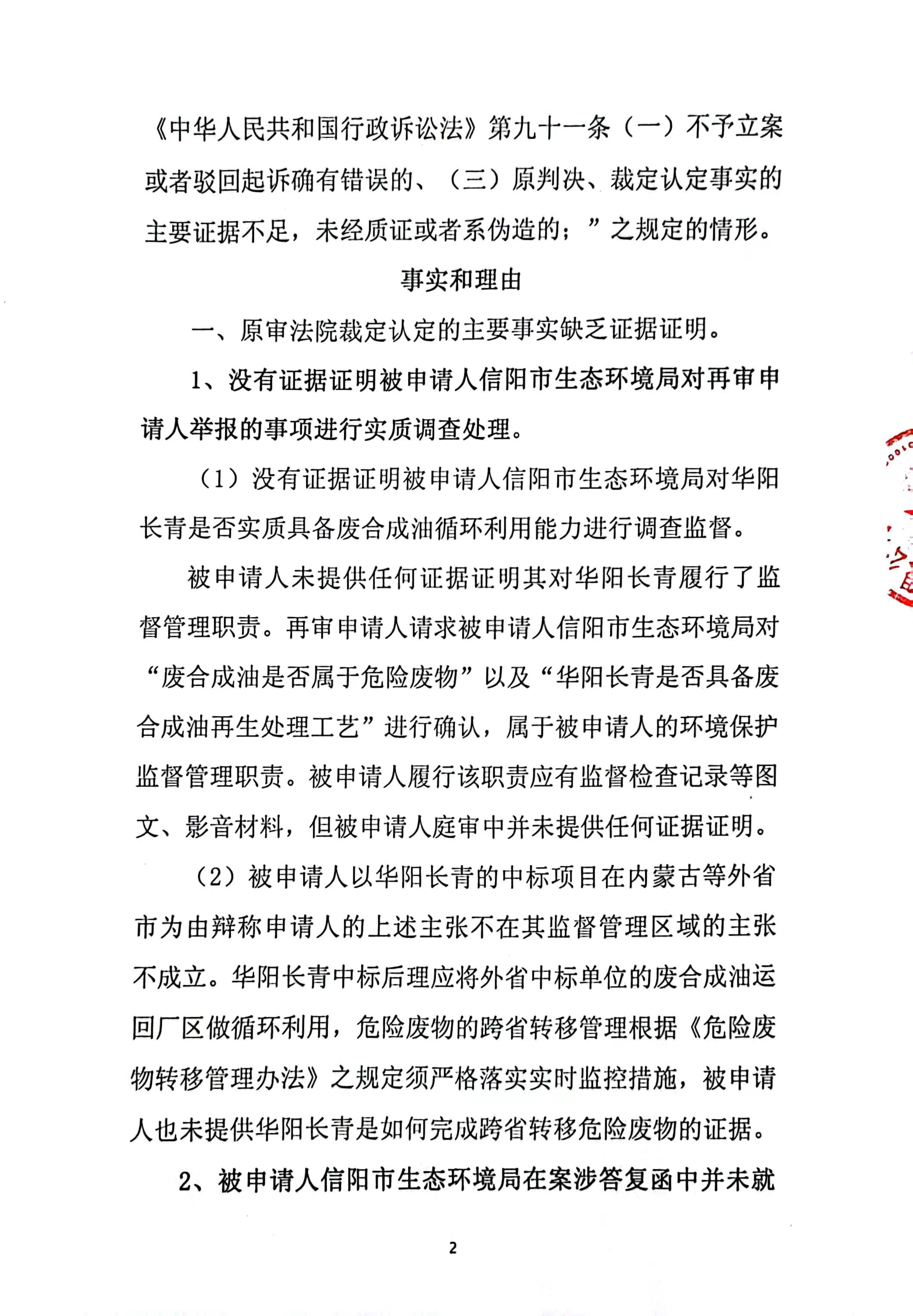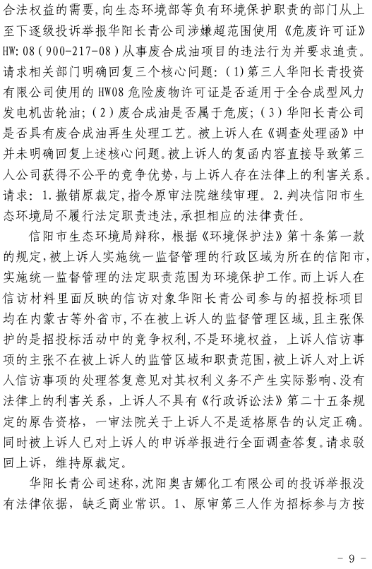 2、一審訴訟請求:請求人民法院判決撤銷被告作出的《信陽市生態(tài)環(huán)境局關(guān)于沈陽奧吉娜化工有限公司舉報(bào)華陽長青投資有限公司違法經(jīng)營及固始分局不作為、亂作為等問題調(diào)查處理的函》;責(zé)令被告對(duì)原告向被告舉報(bào)華陽長青投資有限公司事項(xiàng),限期進(jìn)行重新調(diào)查和答復(fù);判令被告認(rèn)定的廢合成油不應(yīng)按危險(xiǎn)廢物有關(guān)規(guī)定進(jìn)行管理違反法律規(guī)章規(guī)定,無效。
