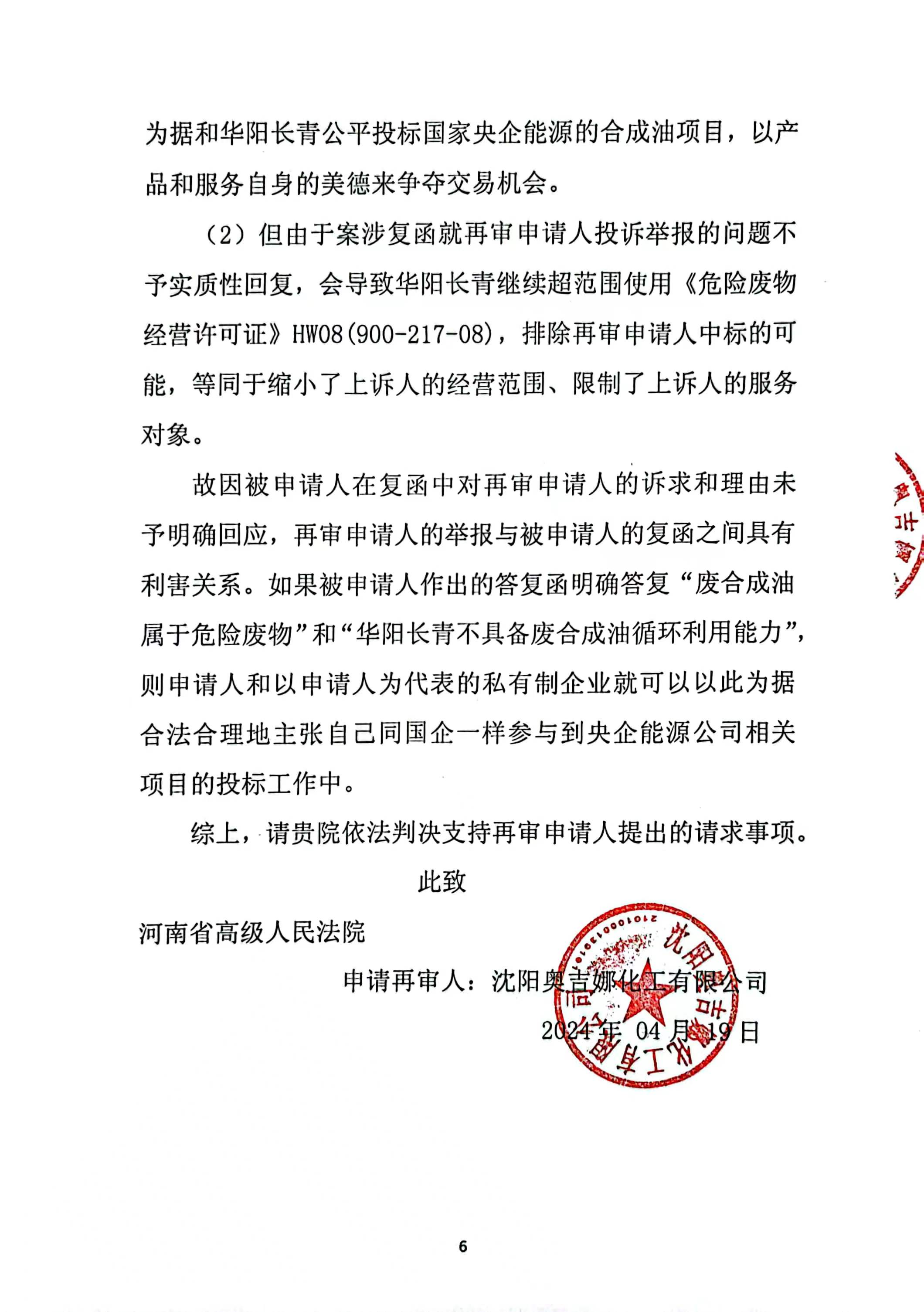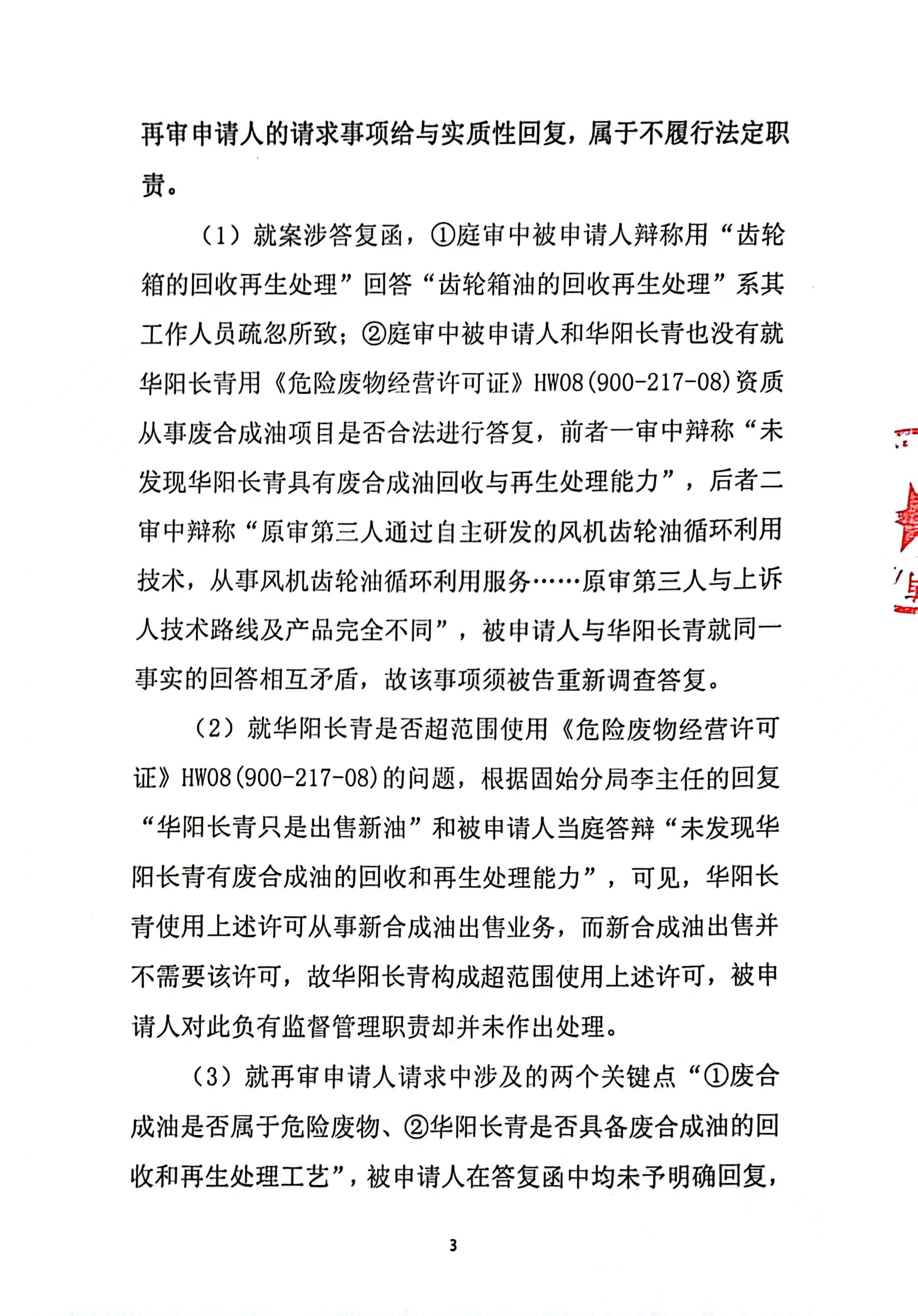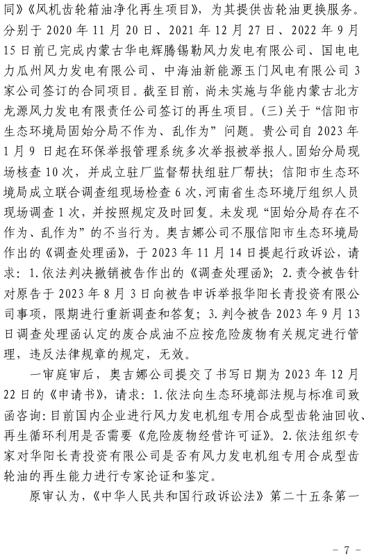 2023年3月9日,奧吉娜公司收到固始分局通過12369環(huán)境信訪平臺(tái)的短信答復(fù):“反映問題不屬實(shí)”。3月10日,奧吉娜公司向固始分局負(fù)責(zé)人電話詢問,其解釋稱:經(jīng)調(diào)查核實(shí),華陽長青公司沒有再生風(fēng)電潤滑油銷售,出售的是新油。否定了奧吉娜公司的舉報(bào)內(nèi)容。對(duì)此,奧吉娜公司表示強(qiáng)烈不滿。3月11日,奧吉娜公司向環(huán)境部投訴固始分局的不作為和亂作為。2023年5月26日,奧吉娜公司收到12369環(huán)境信訪平臺(tái)的短信答復(fù)。答復(fù)部門為信陽環(huán)境局。令人啼笑皆非的是,答復(fù)稱,華陽長青的許可證有效期沒有問題,與舉報(bào)內(nèi)容風(fēng)馬牛不相及。2023年6月13日,奧吉娜公司再次向環(huán)境部提出申訴,指出,奧吉娜舉報(bào)的不是許可證有效期問題,而是許可證的適用范圍錯(cuò)誤、違法。2023年7月27日,奧吉娜公司收到回復(fù)稱,經(jīng)信陽市生態(tài)環(huán)境局現(xiàn)場檢查,未發(fā)現(xiàn)固始分局不作為情況。2023年8月3日,奧吉娜公司向河南省生態(tài)環(huán)境廳(以下稱:環(huán)境廳)舉報(bào)信陽環(huán)境局包庇固始分局的行為。環(huán)境廳對(duì)此高度重視,有關(guān)處長和奧吉娜公司負(fù)責(zé)人進(jìn)行了面談。2023年9月13日,信陽環(huán)境局向奧吉娜公司致《信陽市生態(tài)環(huán)境局關(guān)于沈陽奧吉娜化工有限公司舉報(bào)華陽長青投資有限公司違法經(jīng)營及固始分局不作為、亂作為等問題調(diào)查處理的函》。函中:一是,以“齒輪箱”替換“齒輪箱油”,偷換概念;二是,做出了廢風(fēng)電合成(齒輪)油不屬于危險(xiǎn)廢物的結(jié)論;三是,未發(fā)現(xiàn)固始分局存在不作為、亂作為的不當(dāng)行為。再次否定奧吉娜公司的舉報(bào)和投訴。