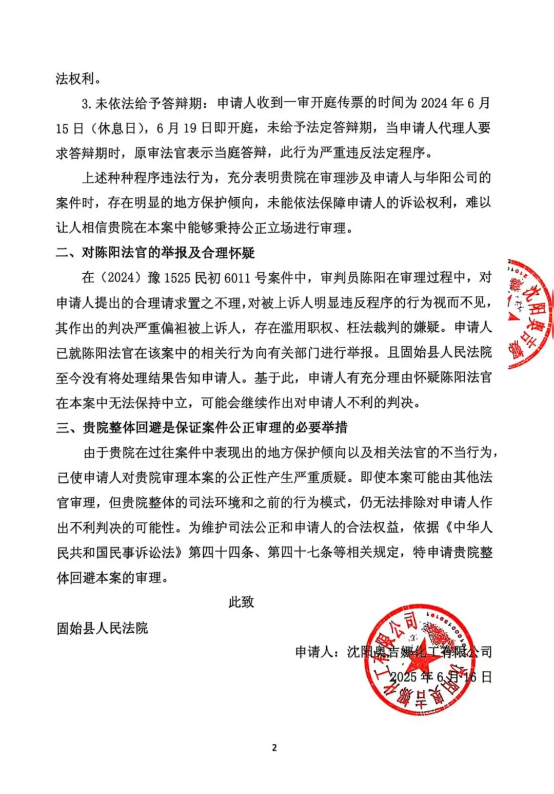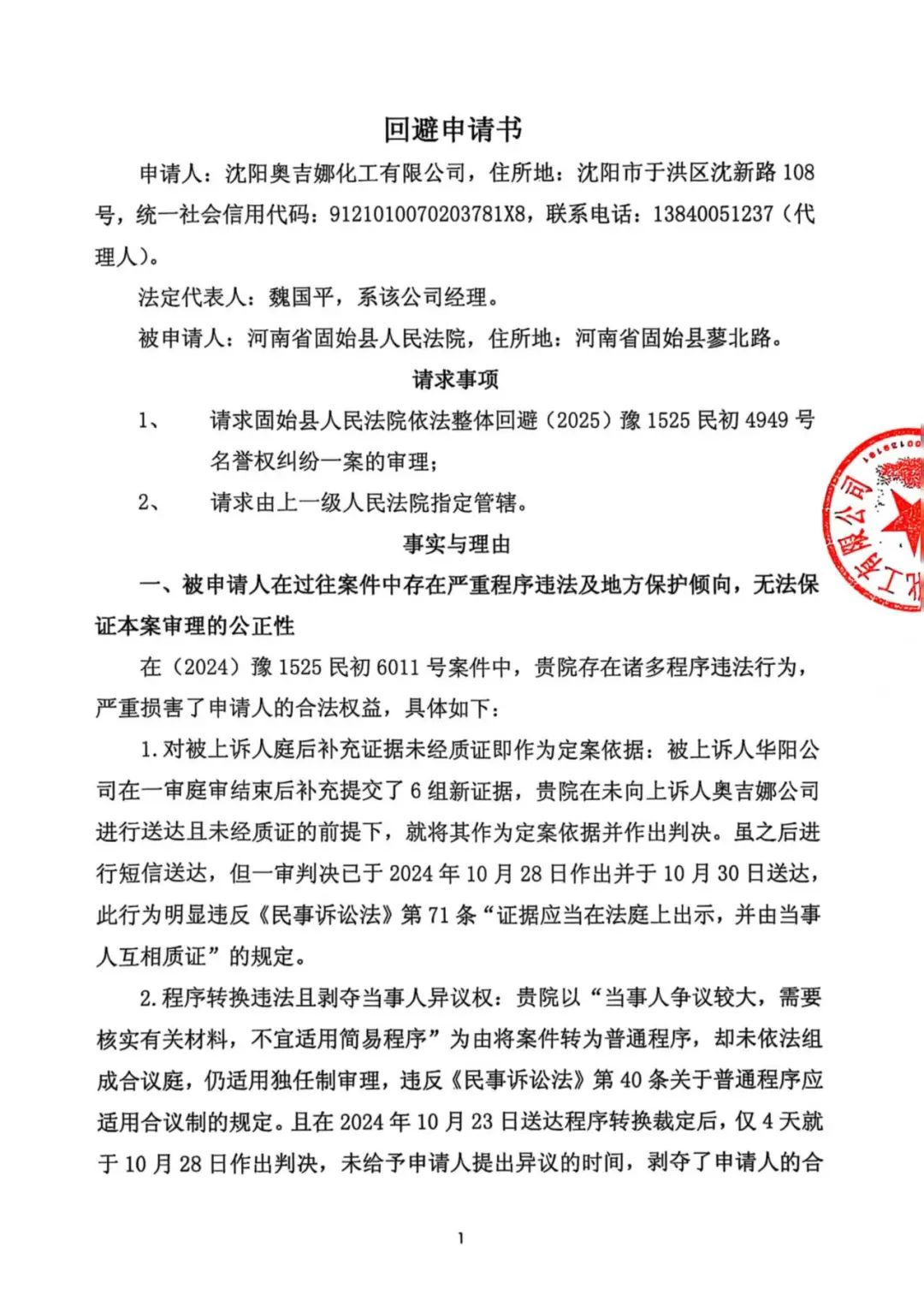 11、2025年6月13日,奧吉娜公司收到固始縣法院2025年7月4日開庭傳票。2025年6月16日,奧吉娜公司以郵寄方式向固始縣法院遞交《回避申請書》,請求固始縣法院依法整體回避(2025)豫1525民初4949號名譽權(quán)糾紛一案的審理。
