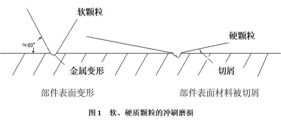 “沖蝕”磨損是指污染顆粒隨著高速流動的油液,不斷向油液系統(tǒng)中部件的表面吹射沖刷,使被沖刷部位受到磨損。污染顆粒有軟硬之分,軟質(zhì)顆粒的沖蝕磨損使被沖擊部件表面變形,在表層下產(chǎn)生缺陷后損壞。硬質(zhì)顆粒的沖蝕磨損使被沖刷部件表面材料晶格錯(cuò)位、滑移,加劇部件疲勞或使材料表面直接被切屑剝離而形成嚴(yán)重磨損。如圖1所示。