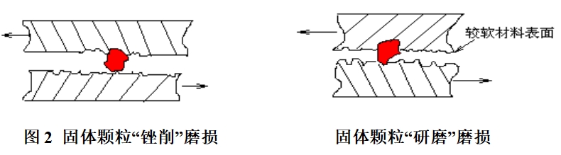 “研磨”磨損是指兩個(gè)相對運(yùn)動部件的間隙中,進(jìn)入與間隙尺寸相近的硬質(zhì)顆粒。部件運(yùn)動時(shí),硬質(zhì)顆粒與運(yùn)動部件表面相接觸,像研磨劑一樣對所接觸的配合表面起著磨削作用,使配合面損傷。這種磨損是油液系統(tǒng)中主要的磨損形式。見圖2所示。